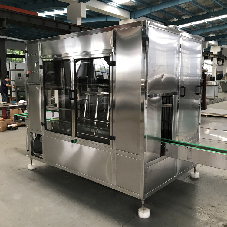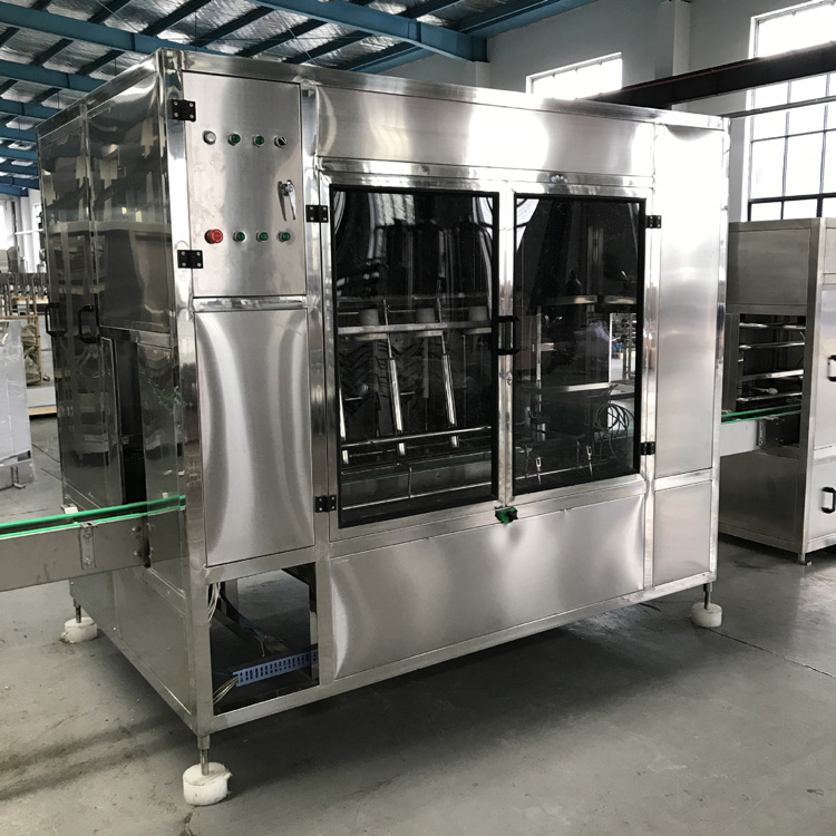 本灌裝生產(chǎn)線專用于3-5加侖桶裝水的灌裝,型號包括了QGF-100,QGF-240,QGF-300,QGF-450,QGF-600,QGF-900,QGF-1200。合消毒、沖洗、灌裝、壓蓋四為一體。沖洗機采用了多種洗液以及消毒液對瓶子進行清洗以及消毒,消毒液能夠循環(huán)使用。瓶蓋會在清洗和消毒后運至旋蓋機自動進行旋蓋。本產(chǎn)品功能齊全,涵蓋了清洗、消毒、灌裝、旋蓋、計數(shù)等功能,高度自動化,實為飲料生產(chǎn)廠家理想的優(yōu)選設(shè)備。